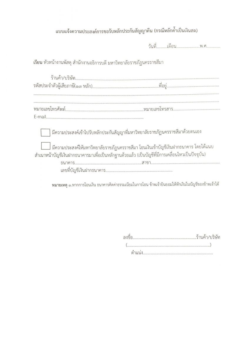 ► แบบแจ้งความประสงค์การขอรับหลักประกันสัญญาคืน(กรณีหลักค้ำเป็นเงินสด) คลิกที่นี่ ⇒ ดาวน์โหลด